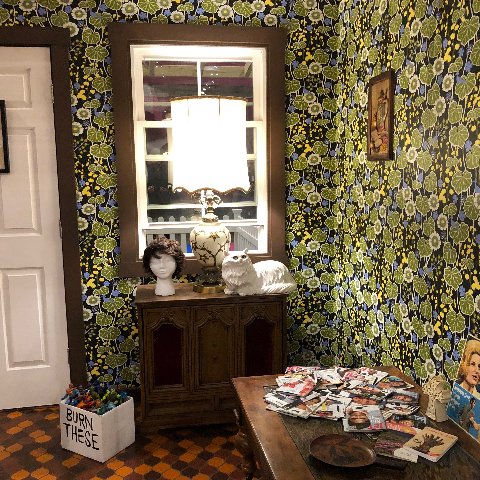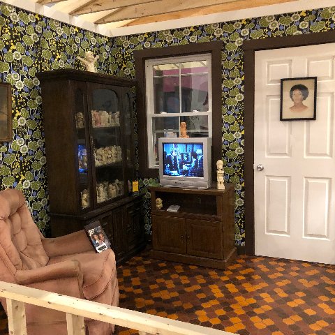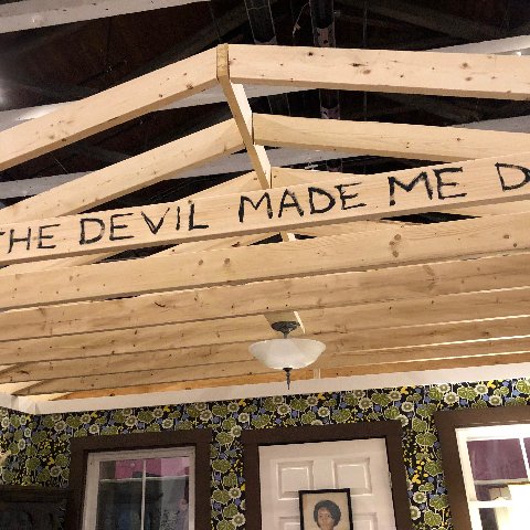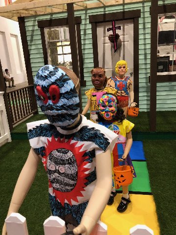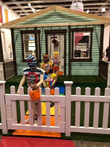 We first encounter a house, the entrance to which is fenced off and populated with a line of kids trick or treating. They wear Halloween costumes and masks. The back of the house has been sliced off to reveal a vintage, uninhabited interior evoking generic Americana. On the wooden beams above the space is hand written “The Devil Made Me Do It.” Indeed.