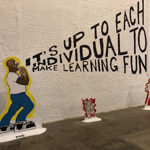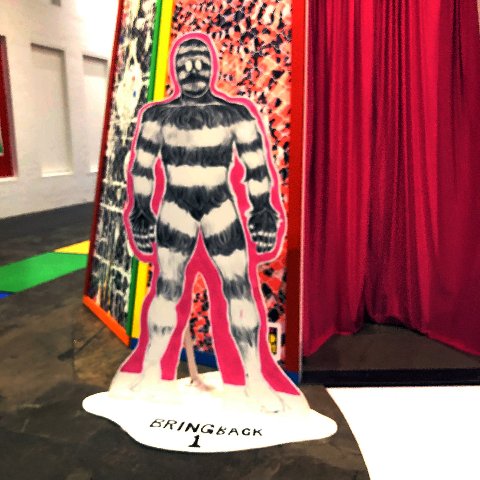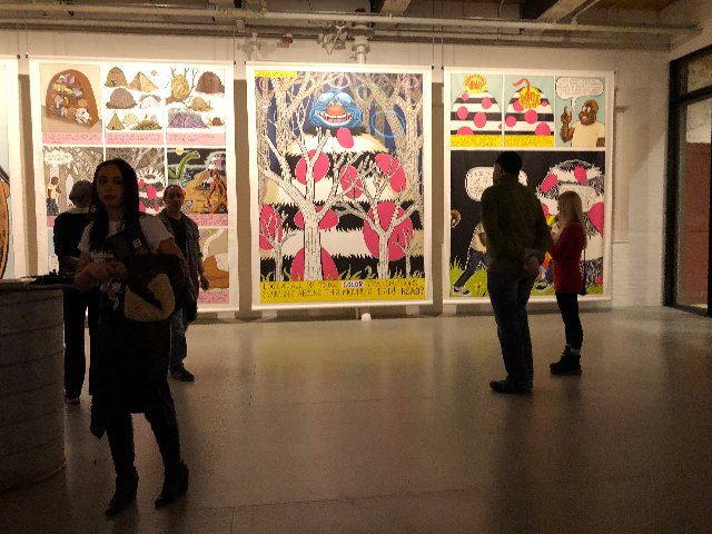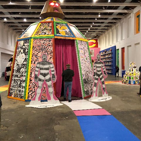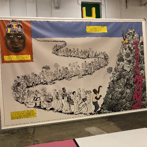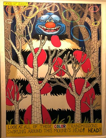 This year’s installation Mind of the Mound: Critical Mass by epic scaled and zealous cartoonist/ illustrator Trenton Doyle Hancock feels rather tween. Working with the MoCA staff of fabricators and installers most of the content is site specific. There are large and small paintings that appear to have been created in the studio.