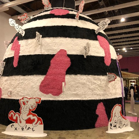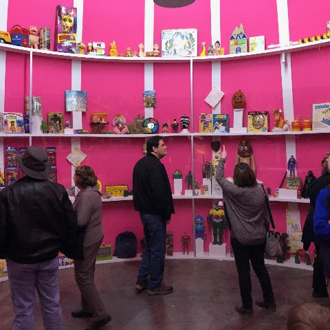There are a number of tent like or mound structures of varying scale. Visitors were filtering in and out of them. One igloo-like interior was lined with shelves on which were displayed stacks of toys. One assumes they conveyed aspects of the artist’s inventive and complex narrative.