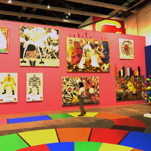 The windowless back room under the balcony has billboard scaled banners that have been printed. There are more large and small paintings on the balcony. From its edge we have a view down into the space. This provides a panorama of a spiral with large, brightly colored floor panels that provide a path or guided tour through the raucous, stridently graphic exhibition.