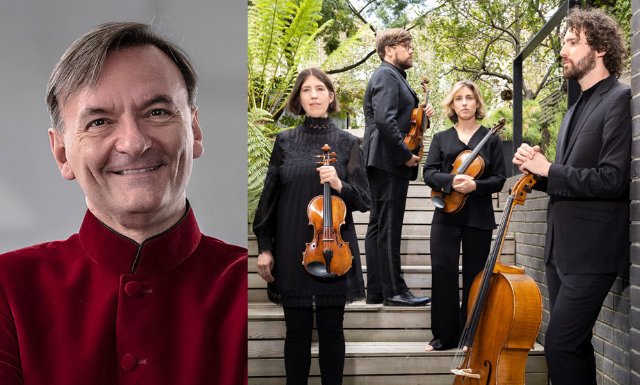 ‘Les Six rencontres” followed. It has an almost jazzy rhythm as we tour Paris and sense the ghosts of composers’ past. Sir Stephen has written: "'Au boulevard’ has ‘Stravinskian spikes elbow across the four instruments, with jagged accents, darting arpeggios and bracing white-note harmonies … the main theme is suddenly transformed into technicolor for the central section, blushed with sentiment and exactly half-tempo. In ‘Au parc’, ‘under a pizzicato accompaniment a gentle, melancholy melody floats and is passed around the players in a haze of decorative variations’, while ‘À l’hôtel’ opens with a bustling fugato, its short subject incorporating repeated notes, an arpeggio and a scale’ and ends with ‘offbeat, snapping chords in pursuit’. ‘Au théâtre’ reveals a ‘skeleton of a motif [which] dances in a recurring harmonic sequence, decorated with each repetition in more and more lurid colours, smeared with lipstick glissandos’, before a change of mood is ushered in by the viola, ‘pushing the music forward to a splashing climax’, followed by a despairing reprise and a conciliatory close. ‘À l’église’ is a ‘serene hymn’ for muted strings, while ‘Au marché’ is a bustling moto perpetuo which moto perpetuo which recalls earlier material and finally returns to the music from the opening of the work."