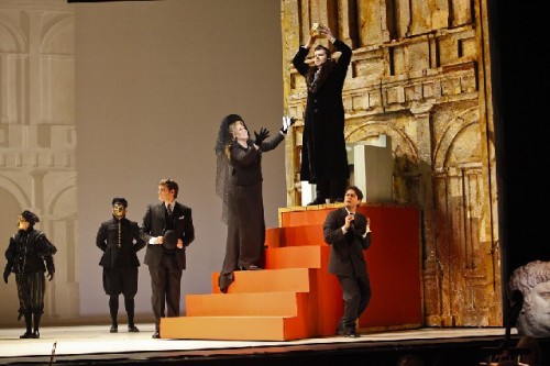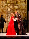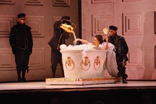 The other singers, David McFerrin as Pallante and Jose Alvarez as Narciso, who essentially played clowns out of the commedia dell’ arte tradition; David M. Cushing as the servant Lesbo (was that intended as a joke?); and Christian Van Horn as Emperor Claudio, did their jobs well, but were overshadowed by the other, for the most part high-voiced singers. Van Horn deserves praise however for gamely playing the Emperor as a clueless man in power who has no idea what’s going on. Whenever he appeared, usually slowly taking off his clothes in order to show how sexy he was, the audience laughed as they were supposed to. Think of any world “leaders,” present or past, “gittin’ it on” - Bill Clinton and Paula Jones? - and you know what I mean.