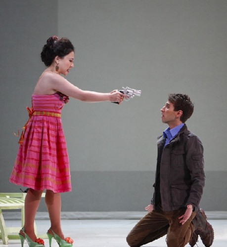One of the visually most striking scenes is of Poppea at her country house lounging on a lemon-green chaise and having a slave apply her suntan lotion. (We know we are in the country because the slaves, all dressed in black and wearing gold masks, carried in a large painting of a tree and sky, and the lighting went up to super-bright.) Her funniest scene, however, occurs when Agrippina and she are having a session of girl-talk. Agrippina gives her too much to drink and her portrayal of a young woman getting drunker and drunker is hilarious. In general, Kim’s pouts, frowns and false displays of innocence are spot on. And she does it all while singing with a clear pure soprano that hits those high notes effortlessly. And she can turn from vixen to victim on a dime. I haven’t seen her in other roles, but on the basis of this performance I can say that Kim was born to play Poppea.
