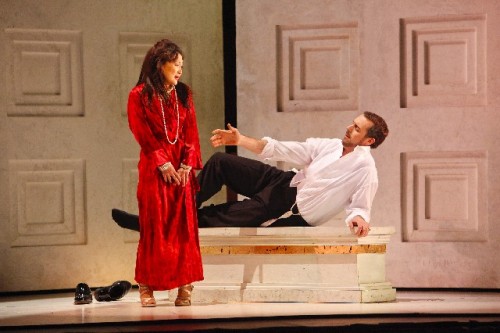 Conklin’s set is basically white for the Roman architecture and gold for the baroque facades. Costume director Jess Goldstein adds the color. Agrippina’s black widow’s weeds, her scarlet gown and Poppea’s coquettish outfits – the lemon-green high heels that match her chaise, for instance - both help define character and add color highlights to the monochrome set. Goldstein’s most memorable work, however, are the costumes he devised for poor Nero. Whether in a white suit that only emphasized his girth or a pair of boxer shorts with red hearts, his outfits served to underscore his bodily discomfit.