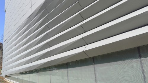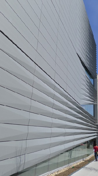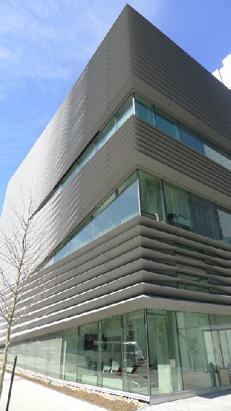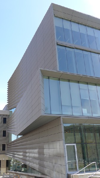Structurally, the Granoff Center is monumental without being monsterous as well as contemporarily contextural in a bricks and mortar traditional campus. It is a sculptural building without dominating its landscape setting. Its visual quality is underscored by the building's dominant glass windows and its horizontally fluted or pleated zinc clad facades translated into beautiful sculptural form and aesthetic resolution.