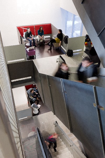 The Granoff Center is conceived by the architects as the next generation loft building with a twist. In addition to its large floor platforms, high ceilings, and long structural spans that allow more flexibility, the intent is for the architecture to foster a collaborative environment. The concept involves three stacked floor slabs that are cut in half and slipped vertically to create six half-levels divided by a shear glass wall. The intentional misalignment connects each studio to one above and below while still maintaining light, sound, and visual control.