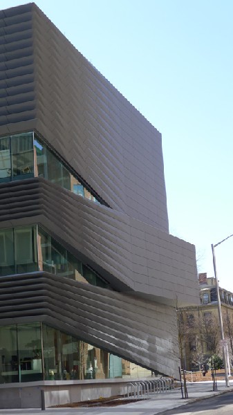 Costing a bit less than $40-million, the Granoff Center is a building dedicated to encouraging faculty and students to create new directions for research, teaching, and production across the boundaries of individual arts disciplines. This is to happen among artists, scientists, and scholars. Historically, this has always been talked about, even sometimes seriously attempted (The Bauhaus, Black Mountain College, etc.), but never really achieved in a sustained way. However there is always hope, and in terms of form following function, this structure may just resonate.