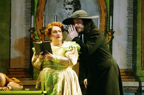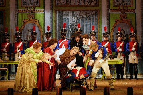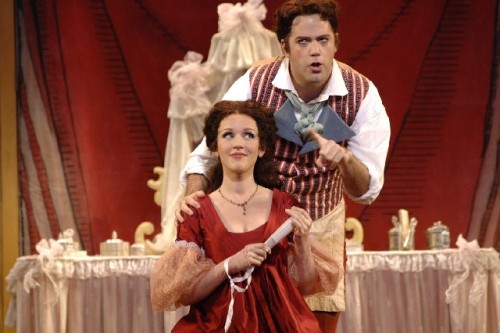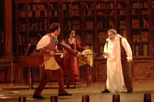 Fortunately, the production has a light touch. The sets by Allen Moyer, borrowed from the Minnesota Opera, are charming. During the overture, we see through a scrim a tilted portrait of Rossini, admittedly a cliché, and, more interestingly, a suspended puppet theater, which hints that the roots of the opera, with its stock characters, are in the venerable Italian commedia dell’arte tradition. The action takes place in a neo-classical theater proscenium set on the stage that suggests that we might be attending opening night at the Teatro Argentina. (The anachronistic footlights are put to good use in the second act.) Scenes, defined by colorful backdrops, are quickly changed, the square outside Dr. Bartolo’s house morphing into Rosina’s frilly boudoir, which in turn becomes the palace’s neo-classical salon, the doctor’s library and the boudoir again. James Scott’s costumes are so complementary that it is a surprise to read that they come from the Washington National Opera.