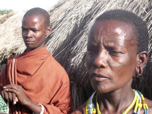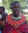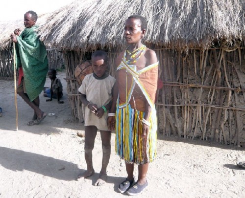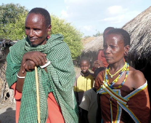 Our afternoon nature walk was canceled due to an incident in the wild. Instead, we made a visit to a Mbugwe family, arranged through a camp staff member of the same tribe. Though non-nomadic and monogamous, the Mbugwe are similar to the Masai in terms of adornment and primitive lifestyle. Both husband and wife had stretched earlobes. He was wrapped in a green-checkered shuka; specially for us, she had on her bridal dress, made of goatskin pounded into fine leather and fringed along the skirt, which was decorated with beadwork. The dwellings were of wattle with thatched roofs. A string of calabashes hung on the outside for drinking.