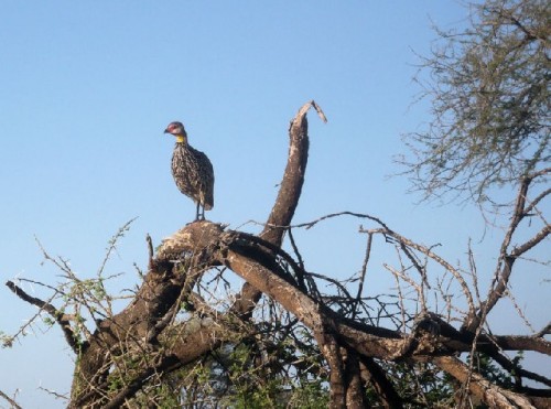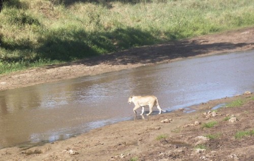 Early the next day we set out to explore the park in a different direction than the day before. Our driver-guides could not promise what we might see in the bush; however, their eagle eyes never disappointed us. They could spot an animal far away, even without the aid of binoculars. On the ground or perched on trees was a wealth of birds, such as red-beaked hornbill, yellow-necked spur fowl, and kori bustard. We were fortunate to see a lion close up, as we waited patiently and quietly for her to approach our jeep. Enjoying the shade provided by the jeep, she surveyed the surroundings. She must not have been hungry enough to dart off after an animal; instead she walked away, heading toward the river, and disappeared after crossing the shallow waters.