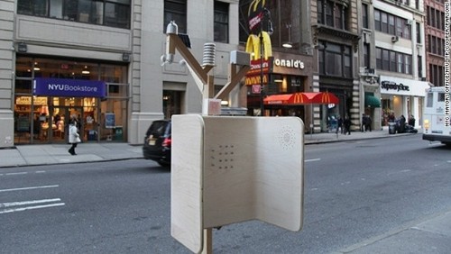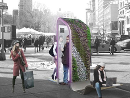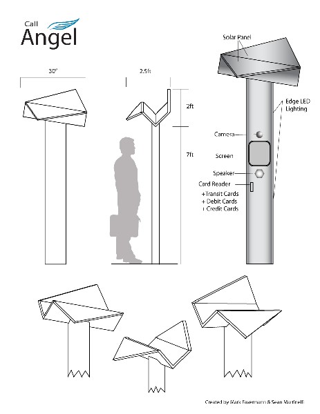 It even has a name and logo: CallAngel. The wings on top of the structure are a covering device and have solar panels to power the technology. The wings also help modulate street noise by acoustically muffling impeding outside sounds. Made from sustainable materials, there is a smart screen, imbedded speakers and camera. The camera may help with local and Homeland security--a little bit like Person of Interest (CBS) and London's ubiquitous camera surveillance security system.