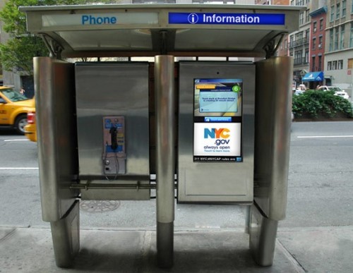 New York City once had 35,000 payphones; now it has around 11,000. How many of these are broken or out of order is unknown. Seems like a lot. Now cell phones are nearly ubiquitous. In recent years, the largest part of payphone revenue is from advertising not calls. Recently, a competition was held in New York City to design the future sidewalk payphone.