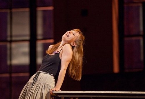 At the end of the first act the actors/ villagers are outraged by the alleged infidelity of Amina. She has been discovered, with no apparent explanation (Amina is a sleepwalker) in the bed of the stranger. The "villagers" have assembled to "rehearse" the celebration of her wedding. Instead the first act ends with them trashing the "rehearsal" hall with torn pieces of paper cascading about. This was indeed far from a traditional ending of the first act. We anticipated a lot of work by the stage hands between curtains. But, actually, Zimmerman rather cleverly has the cast "clean up" the littered stage at the beginning of the second act.