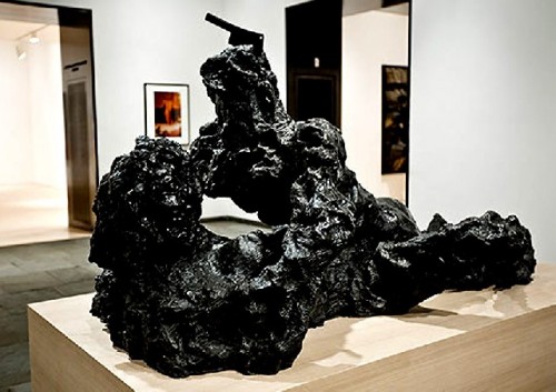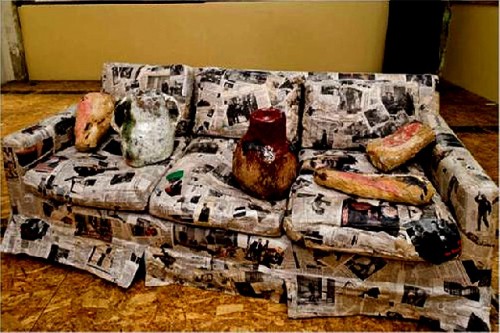 Boston Globe critic, Smee, went ballistic over the sculpture by Jessica Jackson Hutchins. She has papered a couch with newspaper coverage of Obama. How timely. On top of the couch are two funky, primitively created earthen jars. They are crude to a fault. While I hedge on what it all means the piece held my attention and is among the more memorable works in the show.