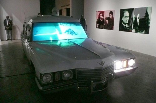 Even in this Biennial which was fair, low key, and Obamaesque to a fault there are implied ground rules. There were artists, such as Lorraine O'Grady (born, 1934) arguably included for lifetime achievement. She displayed a series of three, photographic diptychs pairing Charles Baudelaire and Michael Jackson during comparable phases of their lives. She shared a fairly deep narrow space with a vintage limousine by the collective Bruce High Quality Foundation. Their piece reflected on the only visit of Joseph Beuys to New York and his performance with a Coyote I Like New York and New York Likes Me. A collage of images was reflected in the windshield.