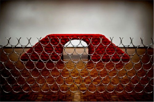 The same might be said of the generous display of a sculpture by Robert Grosvenor (born 1937) a respected artist revived for this occasion. Through a fence of metal circles we look beyond to a padded, red, bridge like structure. It is meant to be viewed for its components and their separate impressions of color, texture and material. This was strong and intelligent work with a firmness of conviction. In this project there was no cacophony to contend with in absorbing its elegance and understatement.