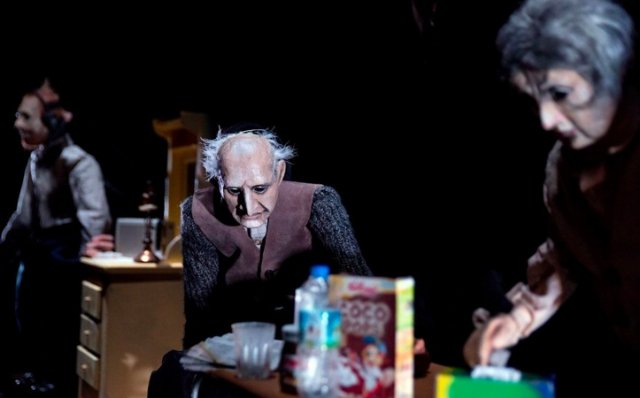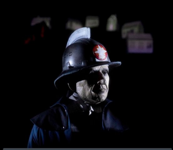 Three puppeteers (Aitor Sanz Juanes, Viktor Lukawski, Andreu Martinez) magically manipulate many figures. The three principal characters are rendered both in miniature and life-size. The only fully created set is dollhouse-sized to house the miniatures. Here we first meet the arson’s family, his mother, a housewife and father, the fire chief. They sip tea and read the newspaper in a room with dollhouse-sized cupboard and table.
