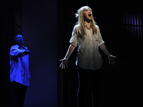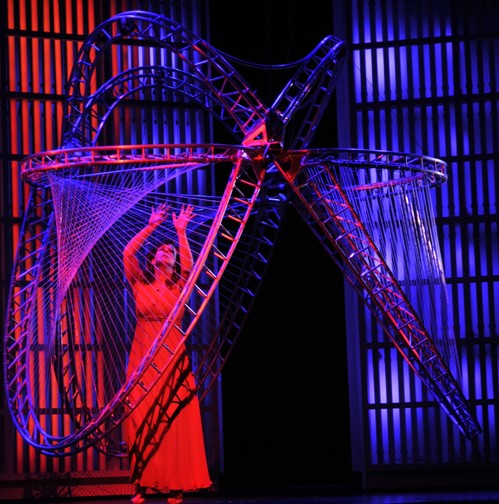 Machover, who holds a position as professor in MIT’s music department, wrote a serviceable, often enjoyable score. His style is eclectic but generally tonal. There were hints of medieval chant, 20th century dissonance, musical comedy and the chugging rhythms of Philip Glass. It all held together well. He also wrote a couple of old-fashioned show-stopping pieces. Evvy’s aria to her husband swallowed up into “The System” while she is enveloped in the chandelier, is richly erotic. “Touch me, touch me, touch me,” she sings over and over as she writhes below. Earlier she and her daughter have a lovely duet about how they will recognize their husband/father once he gives up his body.