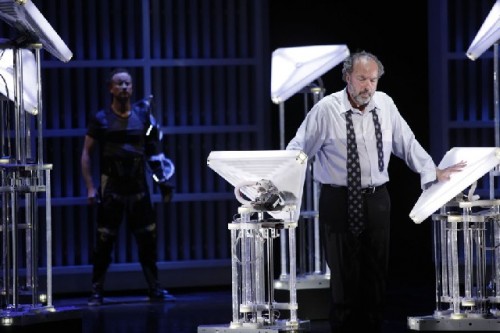 Okay, science fiction is a hard sell for me, but I was able to suspend my disbelief to appreciate “VALIS,” which was adapted from a work by sci-fi master Philip K. Dick. “Death and the Powers,” alas, was written by Randy Weiner, husband of ART director Diane Paulus, and poet Robert Pinsky, the former poet laureate. The premise of the story is promising: man who wants to control the world after death of his body figures out how to do so. But the text is embarrassing: pretentious, overly literary and generally tone-deaf about language. One would expect better from the former poet laureate. The dichotomy that structures the story is between body and soul. Pinsky insists on calling it “meat” and “light.” Well, “light” is fine, but the endless repetition of “meat, meat, meat” almost made me laugh. Couldn’t someone on the large production team have spoken up?