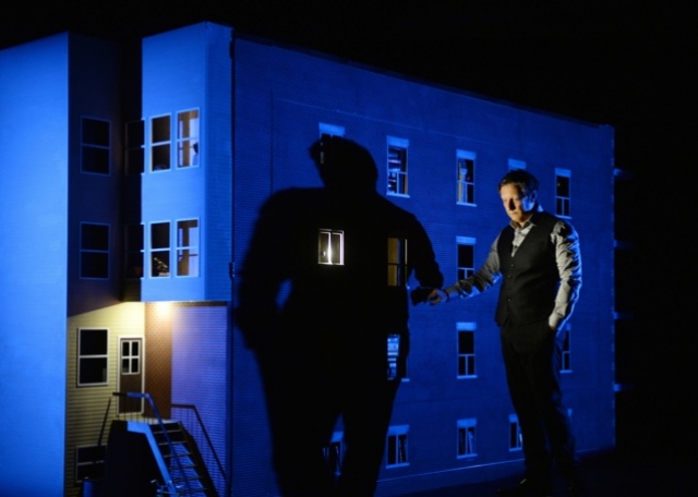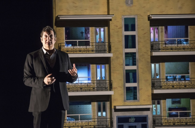 The set created by LePage and his company Ex Machina features the apartment building in Quebec where he grew up. With him, we peak into windows as his earlier life goes on inside. Each window frame has the delicacy and strength of a Joseph Cornell box. Figures are miniatures, perhaps because the life that is being described is painful as well as joyful, and LePage needs not to distance but to miniaturize when describing it.