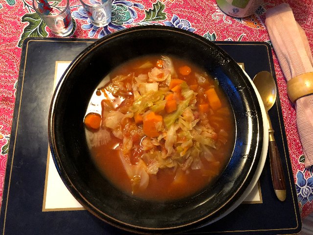 The broth, which we saved, had the flavor of beef, cabbage, carrots, celery and sweet onion. The potatoes were done separately so were not a part of the stock.