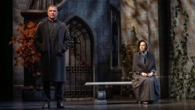The set by David Rockwell is hefty. Yet it moves, capturing the concepts of crossfades indicted by the playwright. Familiar hymns echo as though the space were empty. No curtain separates us from the church, in which Father Brendan Flynn (Liev Schrieber) opens with a sermon articulating his view that doubt can be as strong a community bond as certainty. He takes us from the Descartian realm into the practicalities of everyday life. Later, he recommends taking a knife to a pillow to release feathers. This parable captivates.