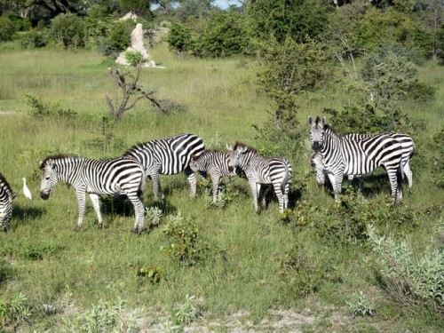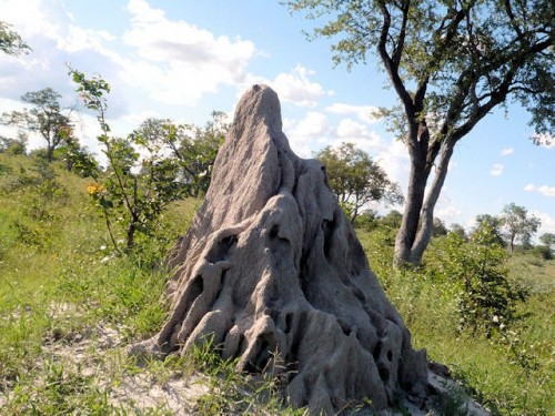 Early the next morning we had our first game drive in this region known as the Caprivi Strip, an elongated panhandle in the far northeast of Namibia. The flat strip fed by multiple rivers is the wettest region in an otherwise arid country. We drove through woodlands passing by groups of zebras and impalas near water holes. These animals benefit from each other's strengths in detecting danger; zebras have good eyesight and impalas have strong sense of smell. Huge termite mounds popped up randomly like sculptures shaped in clay, some with trees growing out of them. After mating, the male and female termites start a colony, which quickly grows in numbers. Thousands of workers build the mound which gets flooded with heavy rains, drowning the termites. Mounds with escape holes are deserted homes which benefit other wildlife. Birds perching on the mounds drop seeds, thus giving life to new growth.
