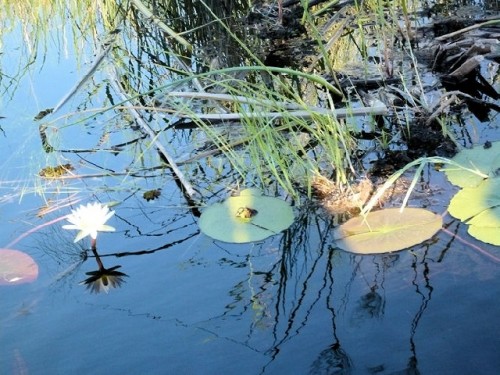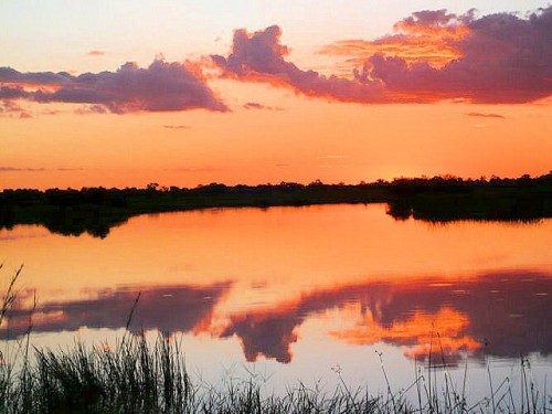 Following our afternoon quiet time, we had tea and then took off in a pontoon boat for a sunset river cruise. The vegetation along the river provides material for practical goods: Common reeds for fences, bulrush for baskets and papyrus for floor mats and baskets. Three types of water lilies grow in the river: white day lilies, yellow night lilies and blue night lilies, a cross breed of both. The lilies are used in vegetables and in flavoring meats. Their leaves differ in shape; the night lily's has a slit. Sipping our choice of a sundowner drink, we watched a pod of hippos come up for air. Shortly thereafter, reed frogs began their nightly symphony and Landy, our lodge's pet crocodile, rushed home to beat the night. Upon landing, the staff met us with trays of Brown Old Sherry, a South African brand that was superb.