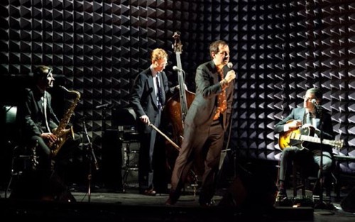 Currently drawing crowds at Joe’s, due to good reviews, word of mouth, and what appears to be a cult following is Ethan Lipton’s and his 3 piece orchestra’s (saxophone, guitar, and bass) musical journey No Place To Go, dedicated as the program informs us to the 100%. The night I was there a cadre of gushing girls, no doubt out partying, laughed at every word that left the 41 year old, singer, song writer, actor, emerging playwright, and self-confessed office temp’s lips, all charmingly delivered by Lipton in the style of Garrison Keillor’s Prairie Home Companion coupled with Tom Wait-like yelp and growl cadences.