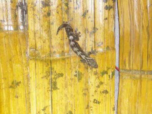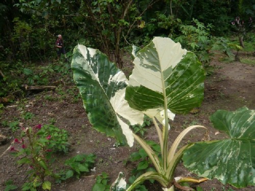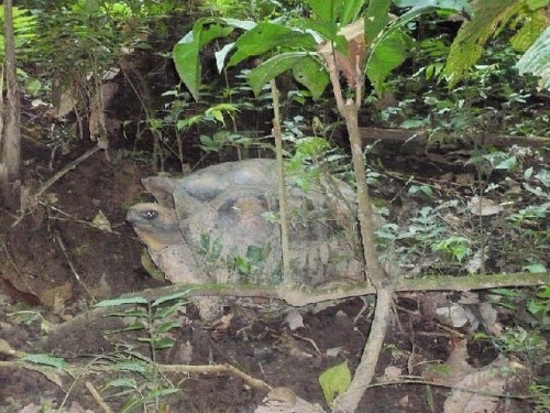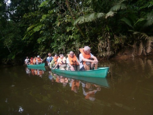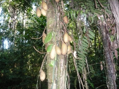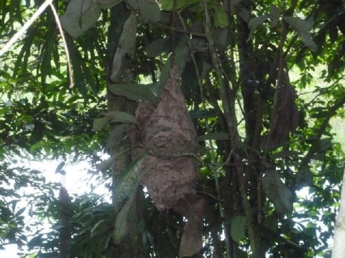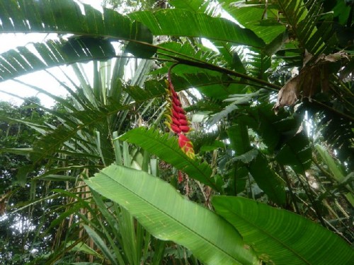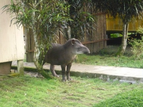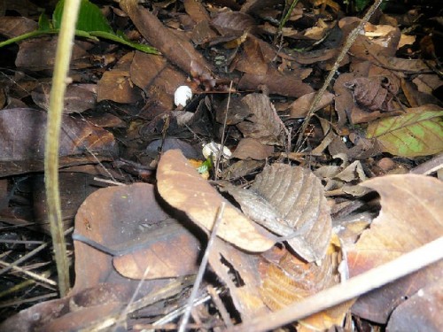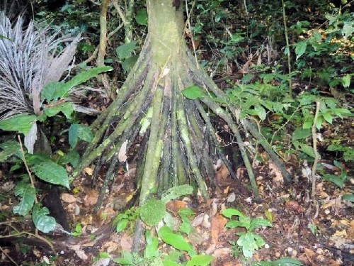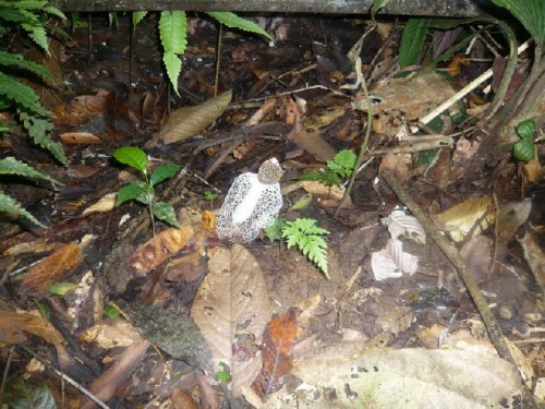 On our way back, we spotted birds' eggs buried in the forest floor. Unfortunately, their camouflage had not kept predators away; the eggs had been vandalized. Among the variety of mushrooms, the one-day mushroom was unique. Called "the penis of the devil" by the natives because of its shape, this mushroom begins tilting as the day wears on, and is flat on the ground by nighttime. Other sightings included colonized spiders, leafcutter ants and a wild juvenile tapir feeding on fruit leaves, using its trunk-like nose to grab them. Baby tapirs are born with a striped pattern that helps camouflage them; the stripes fade away as they mature. Identifying a variety of palms, used in making hats and baskets and vegetable ivory, used for buttons and decorative objects, completed our morning walk.