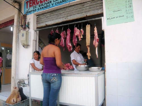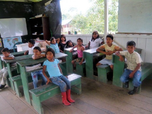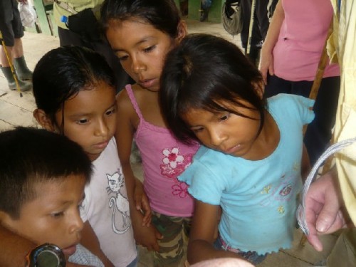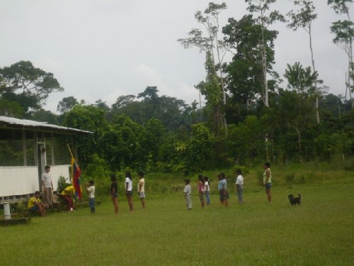 The children were in the school yard for the daily flag ceremony when we arrived. Eleven students, ages 6-13, including a four-year-old visitor, filled the one room school house. The teacher, serving his compulsory two-year duty to serve in a rural area after graduation, had a mother assistant responsible for breakfast. In turn, six mothers bring breakfast to school every morning at 7 and stay on to assist the teacher, who commutes from Coca on his motorcycle. The class meets from 8-10:30 and again from 11-12:30 following recess. The children introduced themselves as customary in Ecuador, by mentioning their given name, followed by the last name of both the father and the mother. They sang for us and showed their books, provided by the government to standardize education. In response to our query about needs, we received a list topped with notebooks, magic markers and toothbrushes, which the group bought for them.