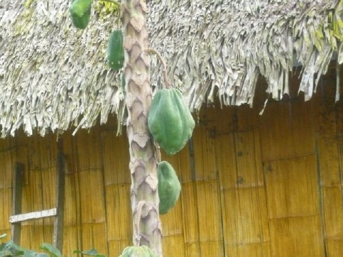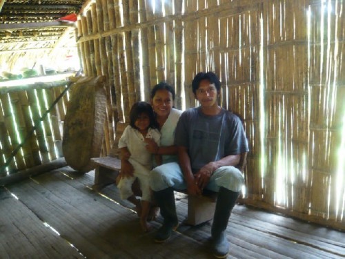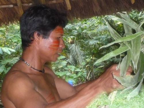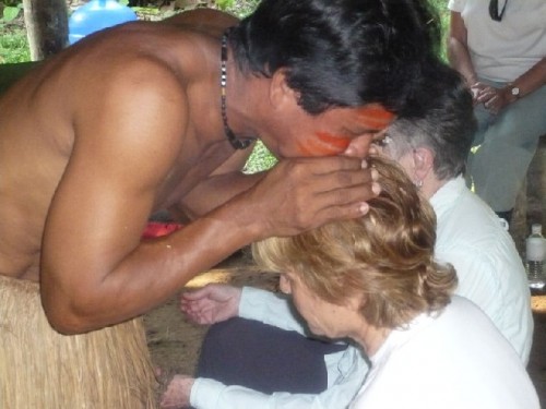 For the next cultural discovery we paddled to the local yachak's hut to witness a healing ceremony. Wearing a grass skirt and red markings on his face, the 37-year-old healer told about his training since he was two. His knowledge of medicinal herbs came from his mother and of healing rituals from his father; he was the third-generation healer and in turn was training his own son. He spoke of the healing process not as a way of getting rid of bad energy, but as a means of balancing good and bad energy. To demonstrate his point he asked for volunteers, who included my sister. With fans made of palm leaves, one in each hand, he began fanning with increasing speed around Fulya, seated with her eyes closed and palms up, ready to receive good energy. Then the healer smoked a cigar wrapped in a banana leaf, blowing the smoke over her head several times after inhaling it. He finished by fanning her again as he whistled. All relaxed, Fulya opened her eyes.