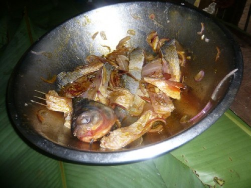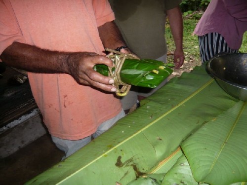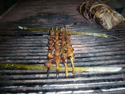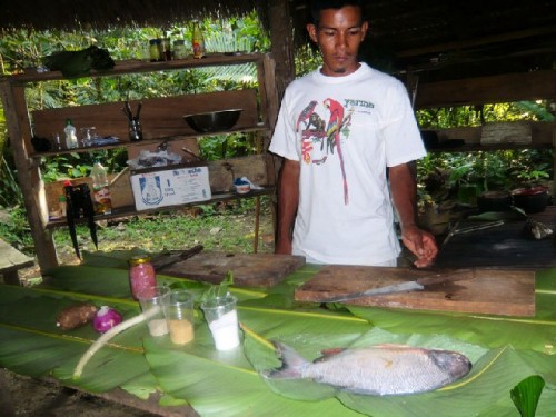 A cooking demonstration followed: We watched as a small piranha was chopped into bite- size pieces, including the head and bones, and marinated in a mixture of chopped red onion, garlic, cumin, salt and pepper and hot sauce made of peppers and tree tomatoes. Then it was wrapped in banana leaves, tied tightly with vines and cooked over hot coals. We enjoyed it with steamed maniac root, plantains and finger bananas, kept in their skin, and wrapped in leaves for cooking. Another delicacy was grubs, cleaned and skewered for roasting or steaming. Grubs are found on palm leaves, are therefore full of palm oil, which drips away during roasting, and are quite delicious cooked in this way.