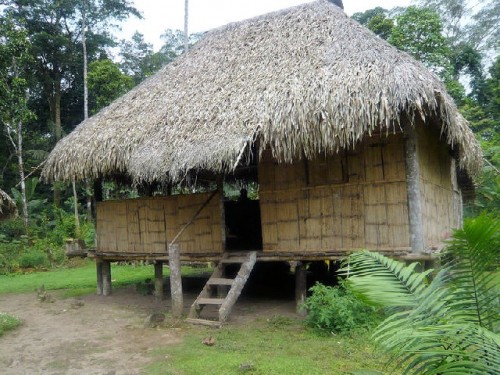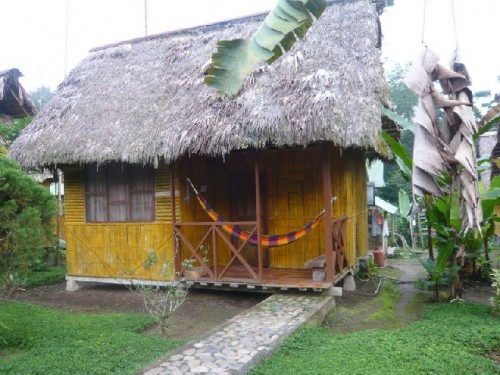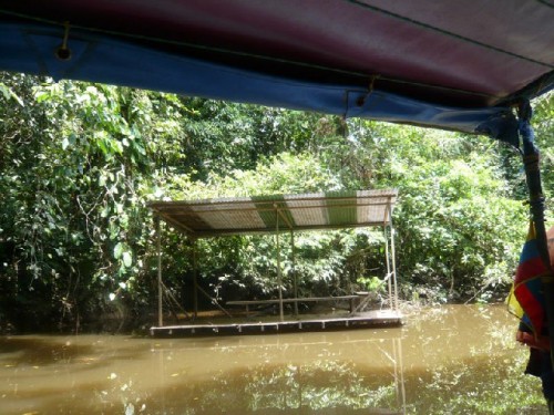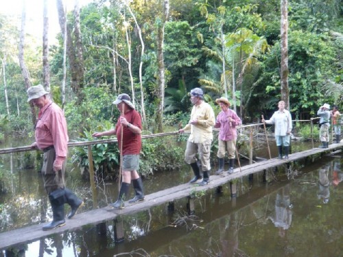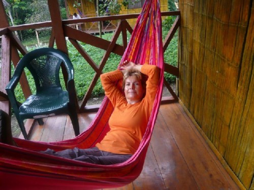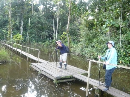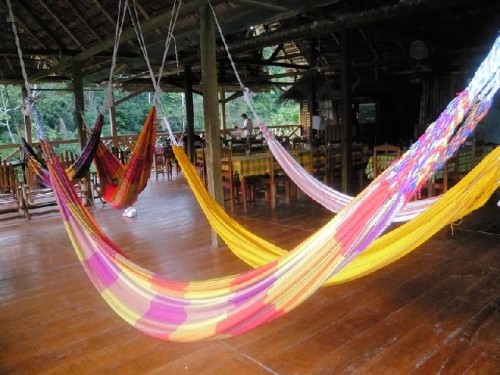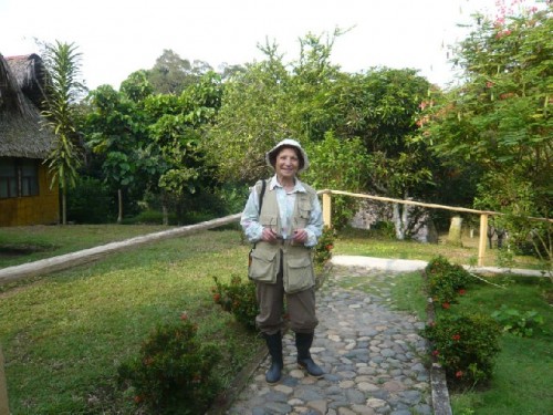 Our cabins were thatched roof huts on stilts constructed to withstand the extremes of the jungle climate; each had a porch with a hammock stretched diagonally across in addition to the multiple hammocks in the main lodge. Despite the heat and humidity, long-sleeved shirt, long pants, sun hat and rubber boots were my usual jungle wear for the nature walks. Additionally, I wore a light-weight travel vest with multiple pockets to carry sunglasses, camera, spare battery, insect spray and sun screen. A water bottle bag with a shoulder strap kept my hands free to take pictures. During our nature walks, Roberto carried his telescope and tripod for close-up appreciation of wildlife. In addition to Roberto, two natives accompanied us to help spot wildlife.