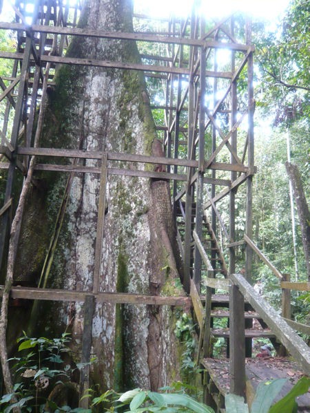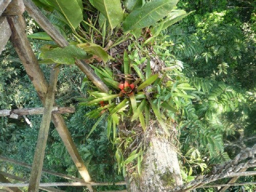 The following morning we observed the forest canopy from above by climbing one-hundred feet up a giant tree tower enclosed by scaffolding, which supported a stairway. To minimize the weight on the stairway, we climbed in two groups of eight. While one group ascended, the other watched our indigenous guides weave a basket out of palm leaves. Flowers and plants in the upper ecosystem loved sunshine and never descended to the forest floor. No sting bees, which looked like tiny black flies, swarmed around us, attracted to the salt in our sweat. Once we got down to the ground level, there was no sign of these flies despite the increased sweat!