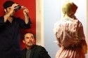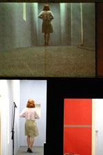 Inspired by filmmaker Antonioni, master of the erotic partial view, one of the four staged actions was only visible on screen. The 'prismatic views' of four simultaneously staged and filmed actions exceeded Shakespeare's theater-in-the-round with fewer angles than a cubist painting and delivered perceived depths of jewel cut, faceted surface. Like a house of mirrors, each scene refracted a single dysfunction: fear of intimacy in a field of accidents. These 'vision tools' Gelpe said, of the staged, filmed and replicated actions, allowed the play to develop 'organically'.