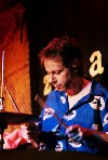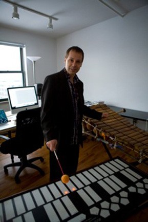 Since 2005, Ligeti has played an electronic Marimba Lumina, a MIDI percussion instrument created by the synthesizer pioneer Don Buchlas. Magnetic, color-coded mallets interact with magnets under the keyboard to produce sound. Of African origin, a traditional marimba is a deep toned xylophone often made of wood and hit with four mallets. The Marimba Lumina allowed Ligeti to expand beyond his DrumKat and need for more sophisticated software.