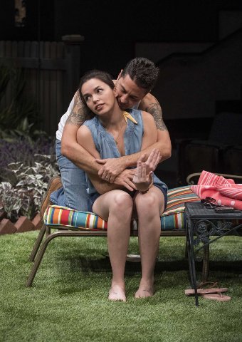 The set includes a small, well tended garden where Joanne Vancura (Elaine Rivkin) has encouraged Camila and her husband, Rafael (Justin Huen) a cook in an Italian restaurant, to enjoy when not working,
