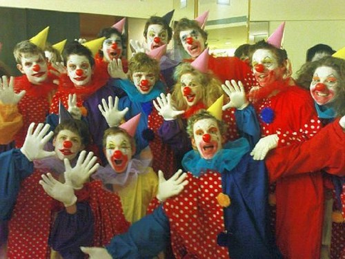 It wasn't long before the clowns bulbous noses were out of joint, and they began hoarding rubber baseball bats while the mimes went into action, building imaginary walls to keep their opponents away. Acts of terrorism were committed. Careers and reputations were lost, bookings mysteriously canceled and costumes burned in effigy.