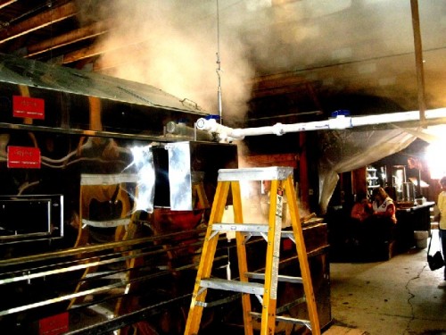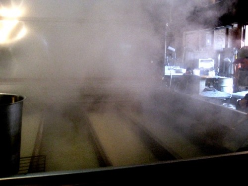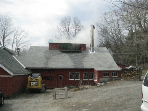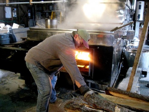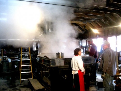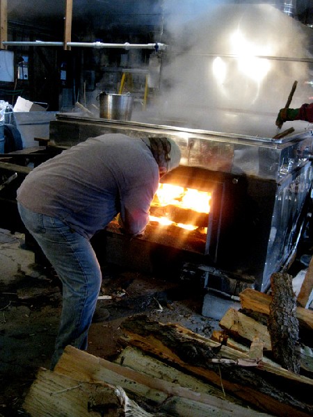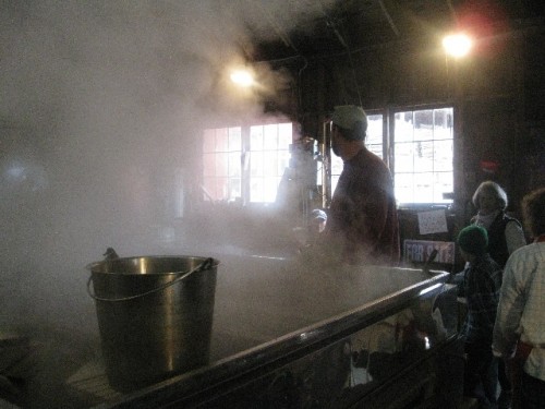 Along the Mohawk Trail we visited a sugar house and watched the large scale operation. Long lengths of split wood were fed in to make the fire under the vat of sap. Much of it escaped as vapor billowing out of a large gap in the roof.