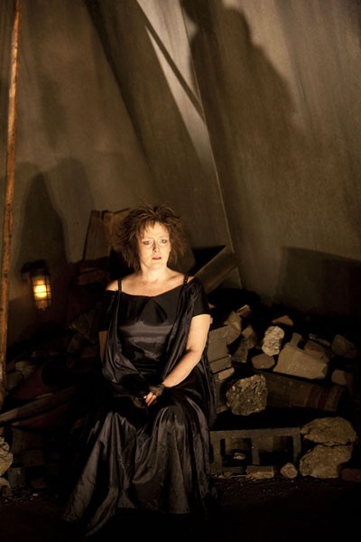 The trope and dramatic device of this upgrade on Euripides revolves around the contemporary character Lotte (Karen MacDonald). She is a lonely single of a certain age who repairs dolls. Ah, there's the plot revealed. As if we missed the point there is a string of broken doll parts above in a stark, constructivist set of ruins by David Reynoso, apparently inspired by Anselm Kiefer's "Jersey Barrier" cement sculptures on view at Mass MoCA.