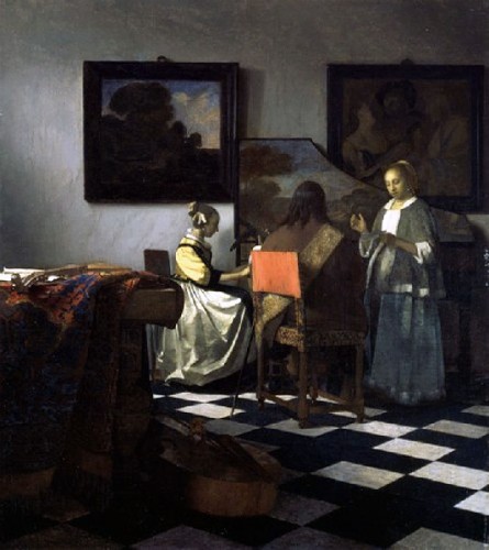 The stolen works include: Rembrandt’s Storm on the Sea of Galilee (1633), A Lady and Gentleman in Black (1633) and a Self Portrait (1634), an etching on paper; Vermeer’s The Concert (1658–1660); and Govaert Flinck’s Landscape with an Obelisk (1638); and a Chinese vase or Ku, all taken from the Dutch Room on the second floor. Also stolen from the second floor were five works on paper by the Impressionist artist Edgar Degas and a finial from the top of a pole support for a Napoleonic silk flag, both from the Short Gallery. Edouard Manet’s Chez Tortoni (1878–1880) was taken from the Blue Room on the first floor. See the image sheet for additional information.