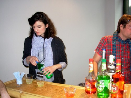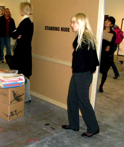 While exploring Volta it happened to be Happy Hour when we visited a conceptual art bar. It was a "work" or installation in which several jaunty individuals poured really terrible cocktail concoctions and engaged in charming small talk. One of those in charge handed me a card that contained no information while explaining that the group does not maintain a website, does not e mail, and exists as a comment on whimsy. The charming Dutch girl seemed a bit looped since they had been tending the bar and mixing it up with visitors since noon. I had a couple of pops and hung out which goes to show that folks will consume just about any alcohol that they don't have to pay for. The vendor selling flutes of champagne was not doing much business with this avant-garde and cheerful competition.