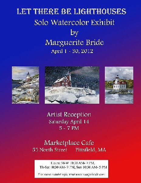 A solo show of watercolors by Pittsfield artist Marguerite Bride entitled “Let There Be Lighthouses” will be on exhibit the entire month of April at the Marketplace Café, 55 North Street, Pittsfield.
