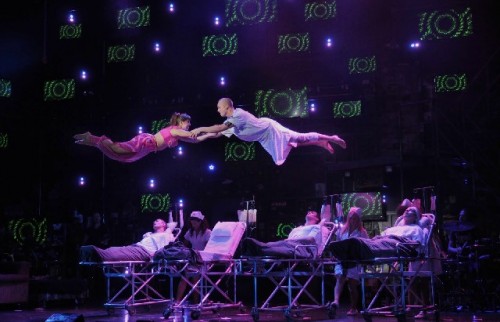 The production is incredibly dependant upon gimmicks. From a Peter Pan-style number with actors flying through the air, to the televised song lyrics being broadcast across the whole back wall of the set; the results is interesting but often unnecessary.