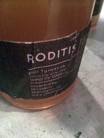 Roditis is best suited for higher altitudes, where the terroir-driven grape can thrive and turn into a superstar. Roditis wines at their best are full-bodied and complex. The one I sampled was pink in color. This is attributed to the grapes' color and was citrus like in flavor. I am sure the wine was unfiltered. It had a very earthy, yeasty quality and, to me, exhibited what the Wild Yeast movement is all about. That entails fermented wines from organic or biodynamic grapes, without sterile filtrations or fining.