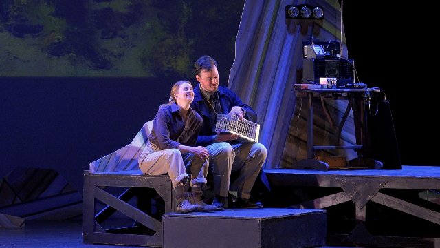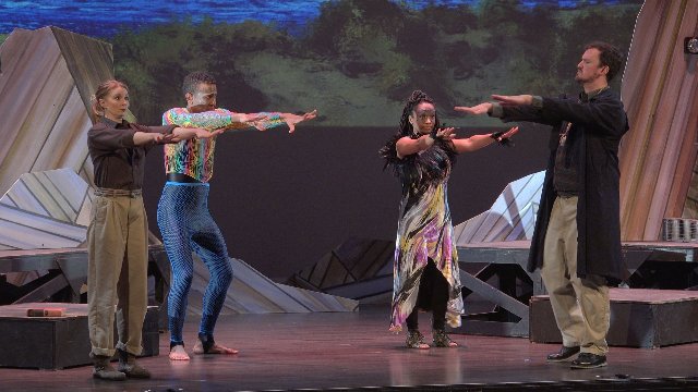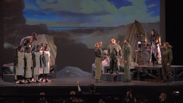 The production is directed by Philip Lowery, and as with the singers and orchestra, the quality of the staging is impressive. The set is simple, with Prospero’s primitive command and control center being the centerpiece. Otherwise, Jeremy Knight’s often changing backwall projection screen provides context, receiving productive use from the opening fall of the baton as the incoming plane, ablaze, seeks to land. In addition to Costume Designer Joy Graham Korst’s penguin costumes, particularly impressive is the colorful, fanciful attire of Ariel and Caliban.