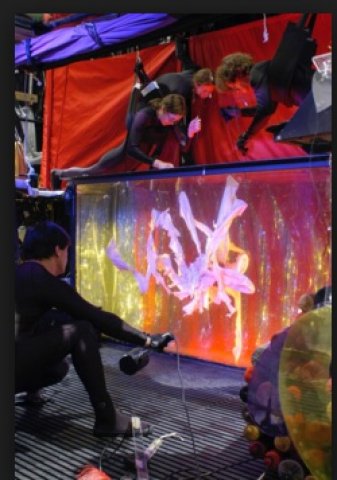 Back stage, the puppeteers report frequent accidents. The aerialist who works over the water in a harness fell into the tank one evening and had to be rescued as part of the drama. Three long, whirling yellow silks on a stick broke during a tornado in the tank, and the puppeteer had to improvise. He is a trained Shakespearean actor who was accustomed to perfection, and had to adjust to this wild world in which anything can happen. Part of the pleasure of the evening is created by recovery from unexpected events.
