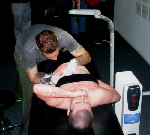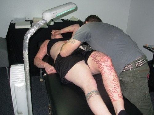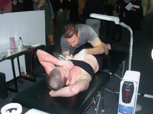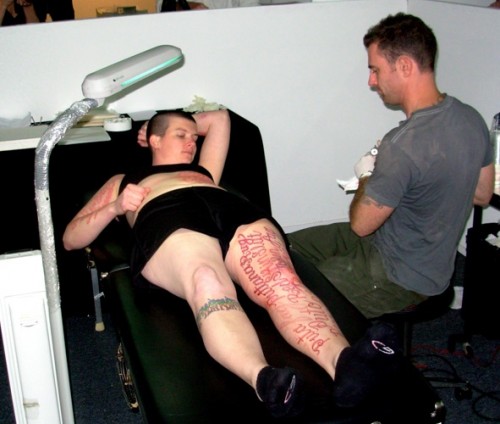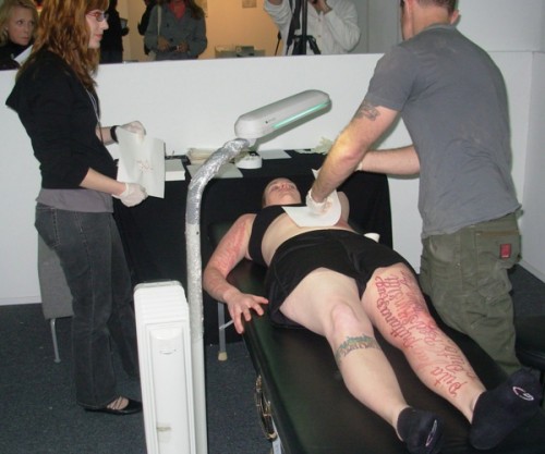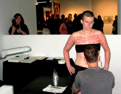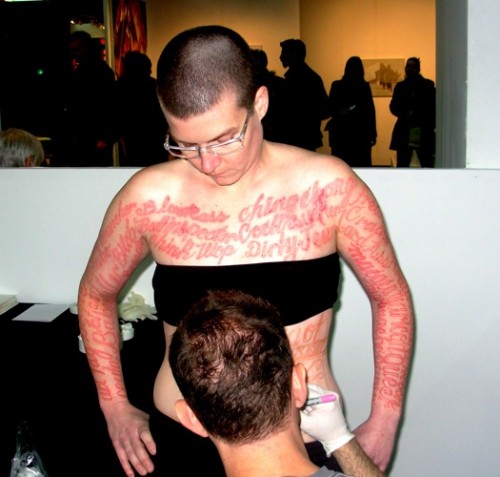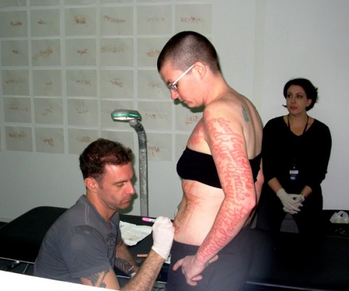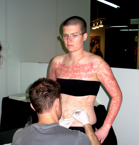 In earlier works "Marker New York" (2006) "Marker DC" (2007) and "Marker Madrid" Coble stood silently while passersby wrote on her body hate speech which they had experienced. In this recent piece "Blood Script" some 75 of those words were tattooed to her skin. Her artist statement says that "Ornate script creates a dichotomy between the beautiful visual forms of the words and the horrible meanings they convey."