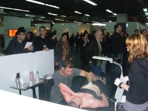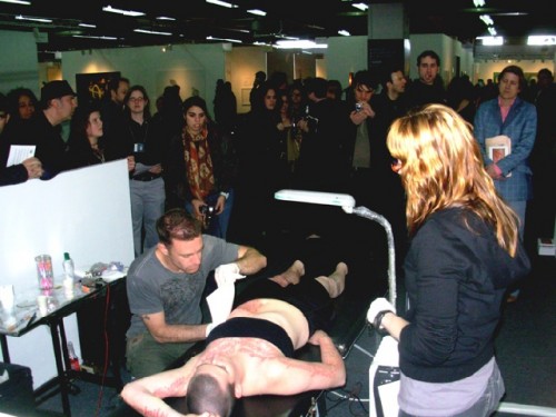 In a conflict of fascination and horror, with a number of other visitors to the Pulse New York art fair, I witnessed a public performance by Mary Coble. Initially, with a throng of others pressing forward to absorb the details of the intense event, a collaborator of the artist, who was wearing gym shorts and a strapless sports bra, inscribed ornately scripted words in red marker all over her skin.